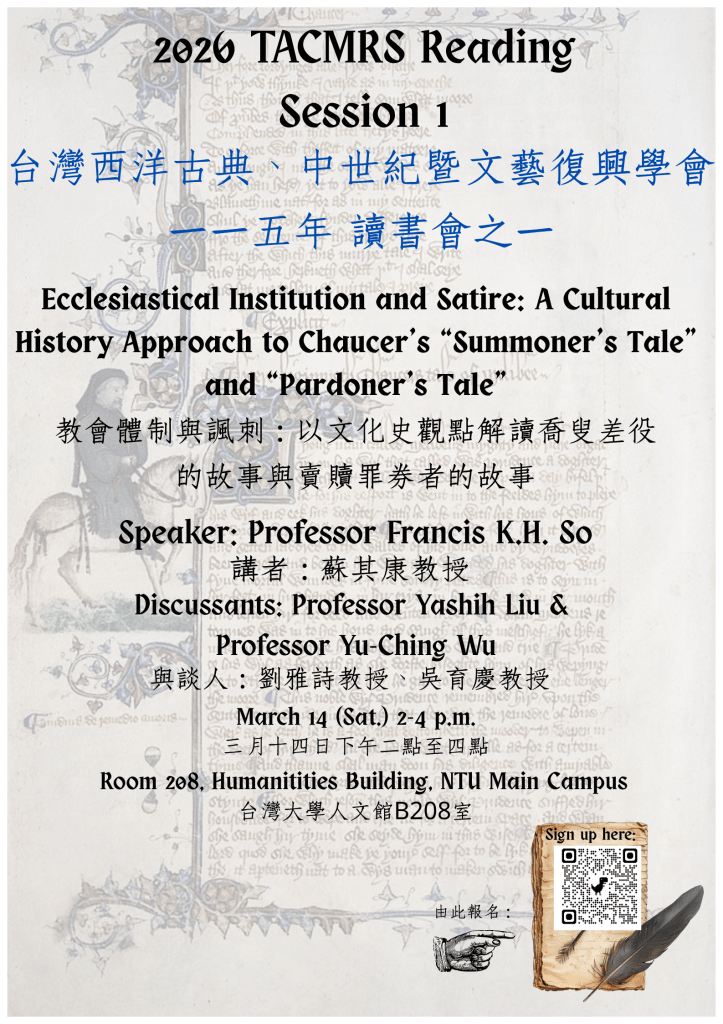 2026 TACMRS Reading Group 1: Ecclesiastical Institution and Satire: A Cultural History Approach to Chaucer’s “Summoner’s Tale" and “Pardoner’s Tale"